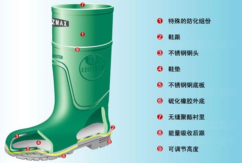 含有安全性能符合EN345-1并能吸收200J能量沖擊的鋼頭以及防穿刺鋼底,NFPA認(rèn)證;40cm靴高,鋼質(zhì)靴頭符合ASTM F2413-05 and CSA Z195